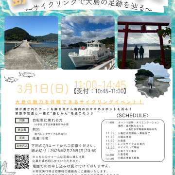 イベント情報 全域 NEW島じかんトレジャー~サイクリングで大島の足跡を巡る~が開催されます 2026年02月05日 忽那諸島 まつやまの里島暮らし体感ツアーが開催されました 2026年01月27日 上島諸島 ゆめしま海道 魅力発見イベントが開催されます 2026年01月21日 全域 アイランダー2025が開催されます 2025年10月28日 全域 【日程変更】大島で農業体験 さつまいも掘り 2025年10月14日 全域 大島で農業体験 さつまいも掘り 2025年10月06日 一覧を見る