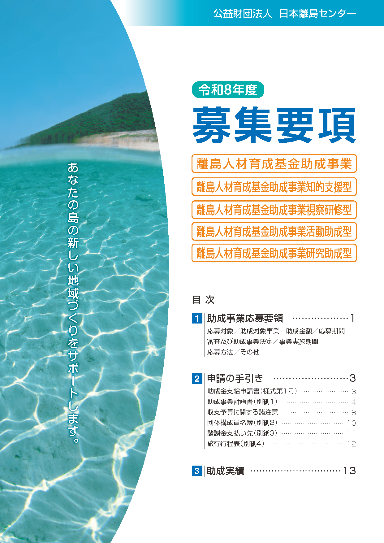 日本離島センターでは、自主的な離島住民活動を支援し、新しい活力ある離島の実現に必要な人材の育成を図ることを目的として設置した「離島人材育成基金」の運用益による助成事業を毎年実施しています。
